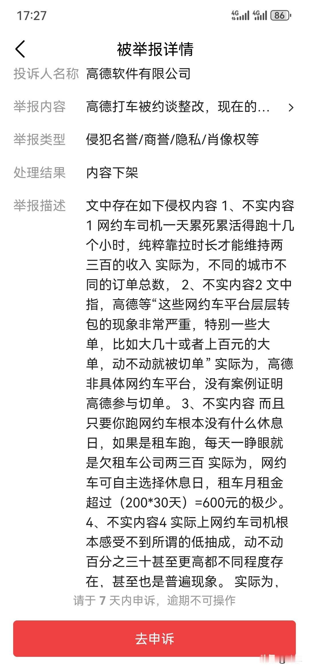 高德打车举报我并删除我的评论?请问你们怕什么呢? 高德打车被约谈,我只是就该新闻事件做了一个评论,我点评的内容是网约车市场存在的现象,并不是说高德公司的问题。 只要高德公司的人认识中国字,就应该明白我是谈网约车市场的问题,并不是说特指高德公司。 高德公司被约谈,是新闻事件,是一个新闻由头,我作为一名老媒体人,就此事谈论网约车市场存在的问题和乱象,怎么就侵你们的权了?你们是看不懂中国字,还是恶意举报侵权?