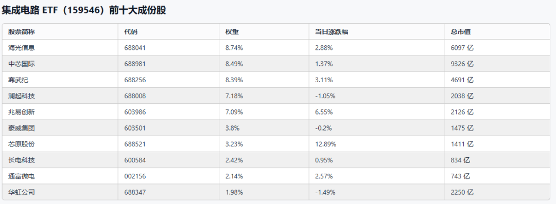 ETF十大重仓个股中,多数实现上涨。其中,芯原股份和兆易创新表现突出,当日涨幅分别为12.89%和6.55%;寒武纪、海光信息涨幅也较为显著,分别为3.11%和2.88%。部分成分股出现下跌,澜起科技、华虹公司当日跌幅分别为1.05%和1.49%。