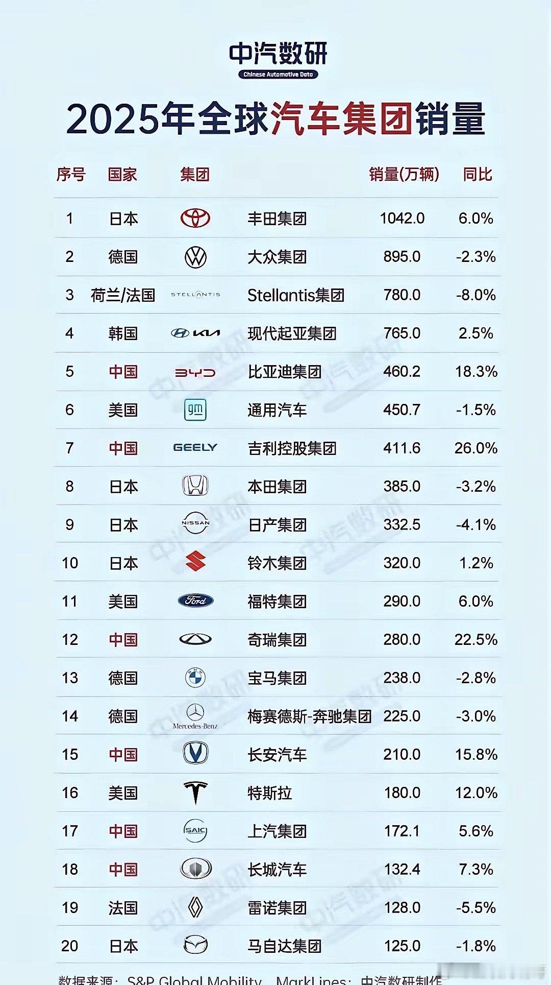 厉害了我的国,汽车制造世界二十强我国占六个,比日本还多!2025年世界汽车销量前20排名出炉,比亚迪汽车销量排名世界第五名,同比增长18.3%,吉利排名第七名,同比增长26%,奇瑞排名第12,同比增长22.5%,长安排名第15,同比增长15.8%,上汽排名第17,同比增长5.6%,长城排名第18,同比增长7.3%。不过日本汽车销售量有五家进入20强,第一名是日本丰田,销量是比亚迪的二倍还多,中国汽车品牌还有很大的努力有空间啊!对此你咋看呢?