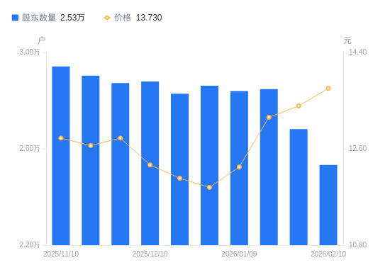 日期A股户数(户)流通A股户均持股数(股)户均持股市值(万元)2026-02-102533312155.4816.692026-01-302681711482.8215.392026-01-202847610813.8314.262026-01-092839410845.0613.302025-12-312861710760.5512.782025-12-202828410887.2413.122025-12-102879210695.1513.162025-11-302873110717.8613.722025-11-202903910604.1813.422025-11-102942110466.4913.40
