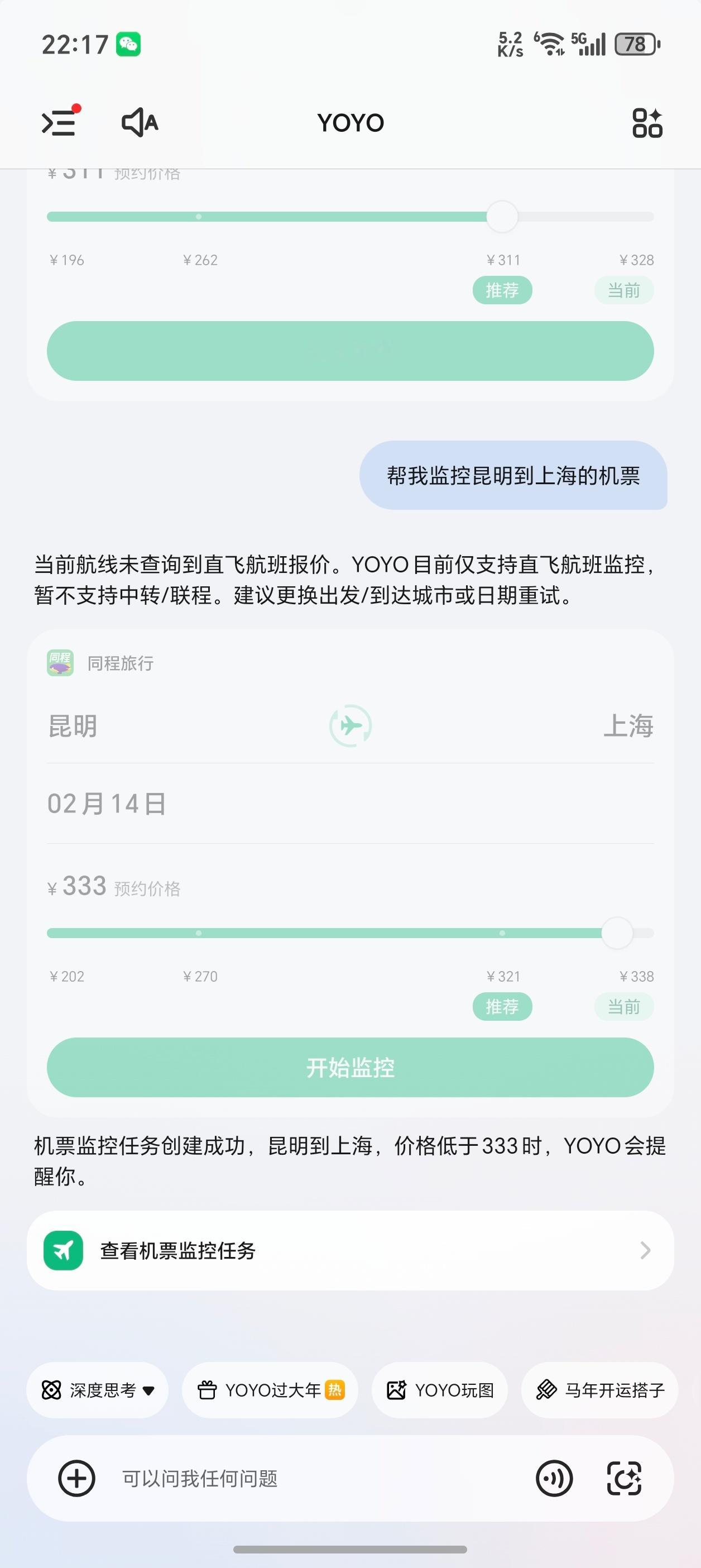 荣耀YOYO这个服务不错哦,可以监控机票价格,设置好价格后,等有达到预设价格时,手机会提醒,这个还是挺方便的啊。数码闲聊站