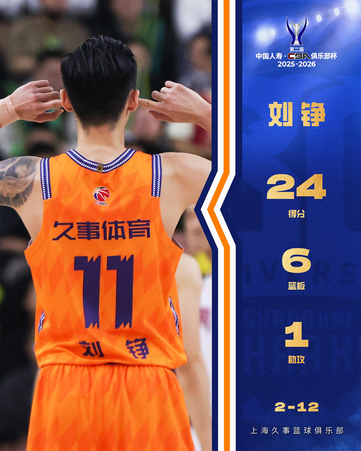 赛后,上海男篮社媒晒刘铮本场数据海报。