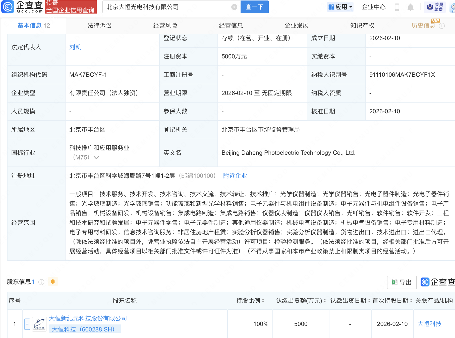 企查查APP显示,近日,北京大恒光电科技有限公司成立,注册资本5000万元,经营范围包含:集成电路制造;集成电路销售;仪器仪表制造;仪器仪表销售;光纤销售等。企查查股权穿透显示,该公司由大恒科技(600288)全资持股。