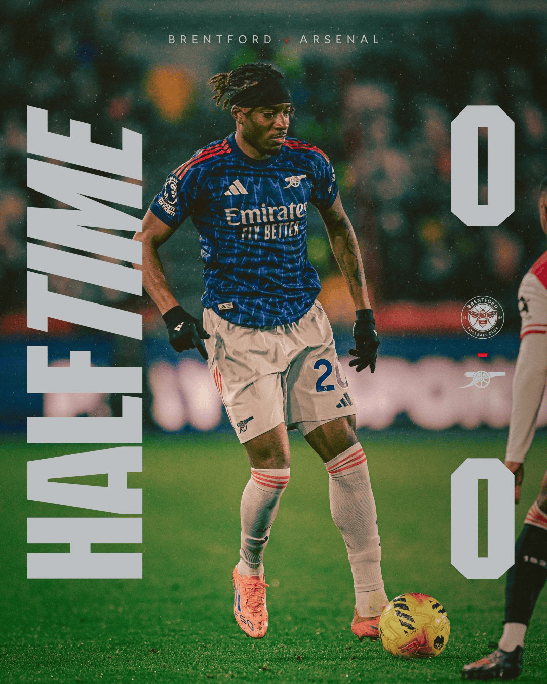虎扑02月13日讯英超第26轮,阿森纳客场挑战布伦特福德,上半场比赛结束,双方暂时战成0-0。