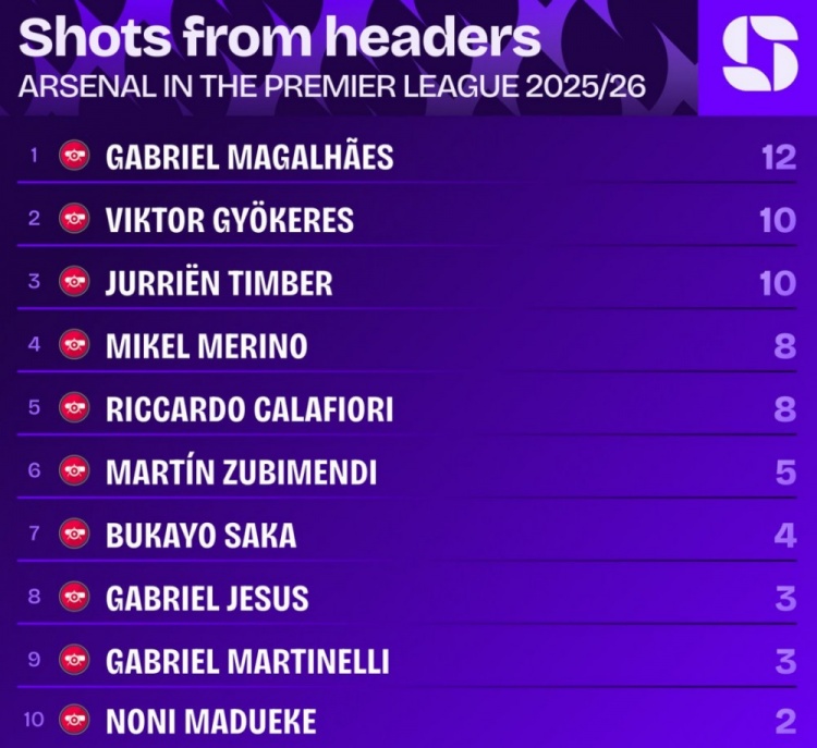 Squawka指出,阿森纳本赛季联赛头球打进11球,英超球队之中最多,这是马杜埃凯职业生涯至今在英超攻入的第3粒头球,此前两粒头球进球来自于2024年对阵西汉姆、2025年对阵狼队的比赛。