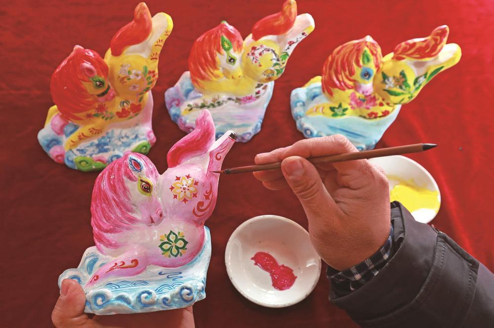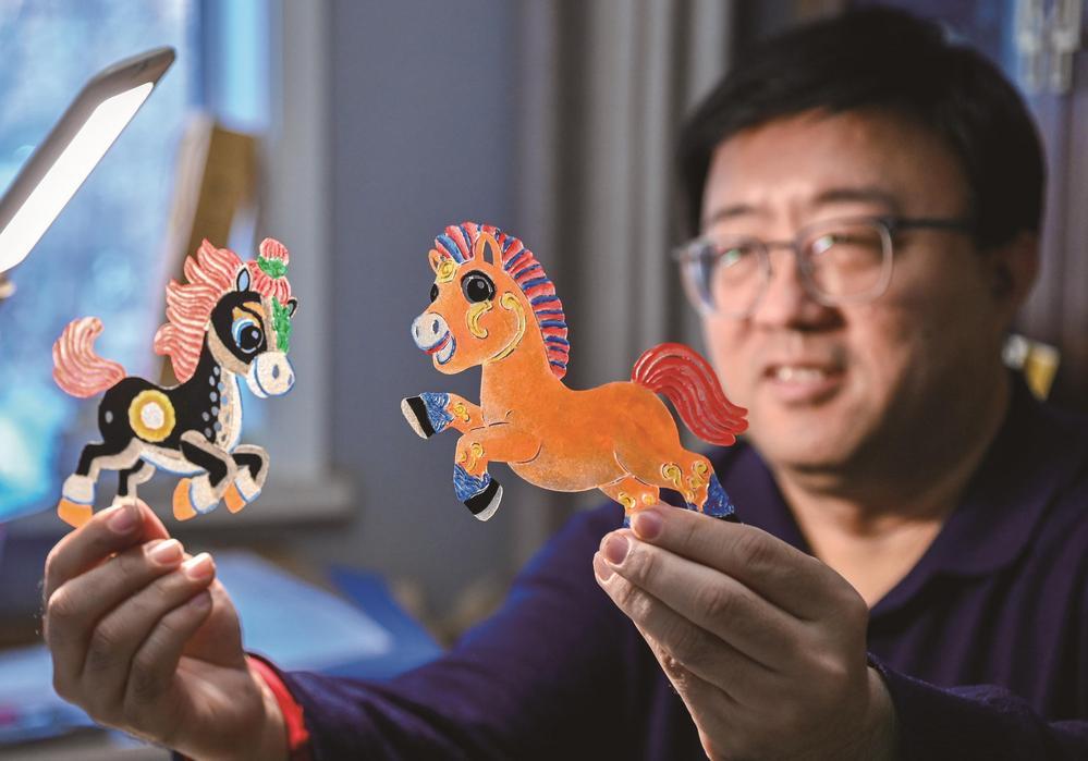 在民间手工艺工坊,泥塑艺人手持细笔,为泥塑骏马勾勒眉眼、晕染色彩。红粉黄蓝的彩绘泥塑马造型各异,或缀以祥云花纹,或饰以吉祥图腾,每一笔都饱含“龙马精神”的美好期许。皮影非遗传承人精心雕琢马年主题皮影作品。彩马皮影色彩艳丽、鬃毛飞扬,奔跑姿态灵动,既保留传统皮影的刻绘精髓,又以“马到成功”的吉祥寓意传递新春祝福,让非遗技艺在指尖焕发年味生机。