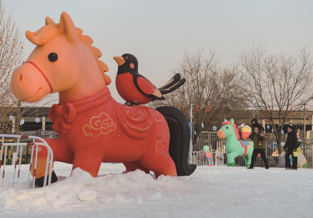冰雪乐园里,萌趣马雕解锁文旅新体验。皑皑雪地上,橙红色骏马雕塑身披金纹,背上喜鹊伫立,“马上有喜”的吉祥寓意扑面而来;远处彩色萌马雕塑错落分布,亲子家庭在雕塑旁滑雪嬉戏,欢声笑语回荡园区。乐园推出的雪地赛马、萌马DIY等互动活动,将冰雪乐趣与生肖文化结合,让市民在体验户外游乐的同时,感受马年民俗的独特魅力。