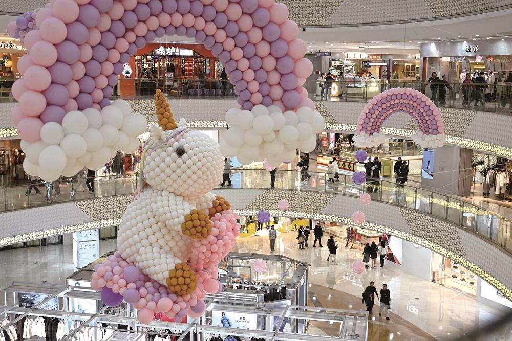 市井烟火中,马年元素点亮消费场景。火锅门店的玻璃橱窗上,“马年大吉”的红底贴画搭配萌趣卡通骏马,与“约个火锅吧”的温情邀约相映成趣,食客围坐涮煮的身影,让年味在热气氤氲中升腾。城市核心商圈内,巨型独角兽气球装置高悬中庭,粉紫配色的萌马造型与流光溢彩的商场灯光交织,往来市民驻足打卡、采购年货,消费热潮持续涌动,马年主题装饰成为激活假日经济的“新引擎”。