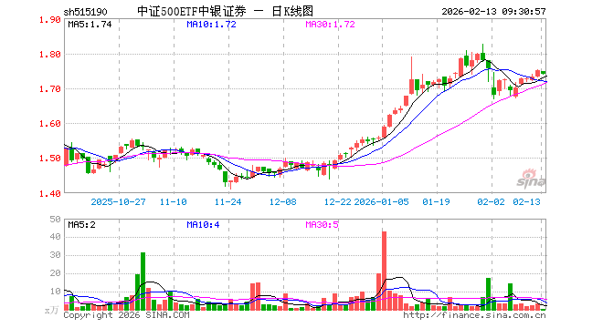 中证500ETF中银证券(515190)业绩比较基准为中证500指数收益率,管理人为中银国际证券股份有限公司,基金经理为张艺敏、刘先政,成立(2020-04-30)以来回报为75.22%,近一个月回报为2.09%。