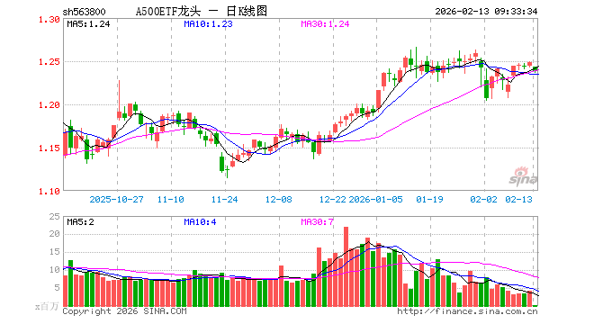 2月13日,A500ETF龙头(563800)开盘跌0.40%,报1.243元。A500ETF龙头(563800)重仓股方面,宁德时代开盘跌0.07%,贵州茅台涨0.00%,中国平安跌0.59%,中际旭创跌0.66%,紫金矿业跌3.75%,招商银行跌0.10%,新易盛跌1.02%,美的集团跌0.36%,兴业银行涨0.05%,长江电力涨0.04%。