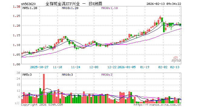 全指现金流ETF兴业(563620)业绩比较基准为中证全指自由现金流指数收益率,管理人为兴业基金管理有限公司,基金经理为张诗悦、徐成城,成立(2025-08-06)以来回报为21.10%,近一个月回报为5.34%。
