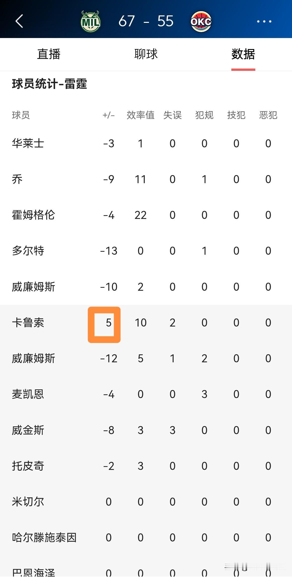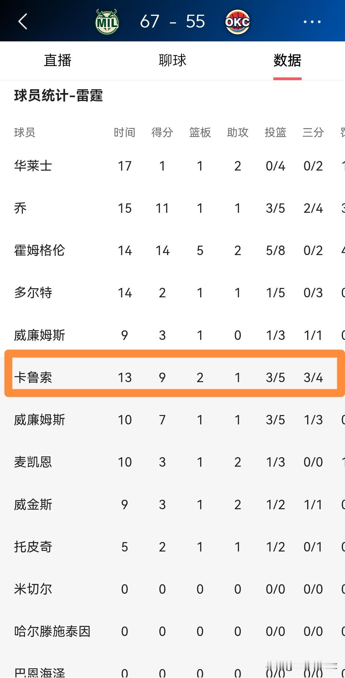 雷霆大将卡鲁索真是一枝独秀!在今天雷霆主场迎战雄鹿的比赛中,目前双方半场战罢,虽然雷霆以55:67落后对手12分,但是卡鲁索却打出了无可争议的表现,他的场上正负值是全队唯一的正值,堪称一枝独秀。 在前两节比赛中,卡鲁索替补出战13分钟,三分球4中3得到9分,还有2篮板1助攻1抢断,他的场上正负值为球队最高的+5。