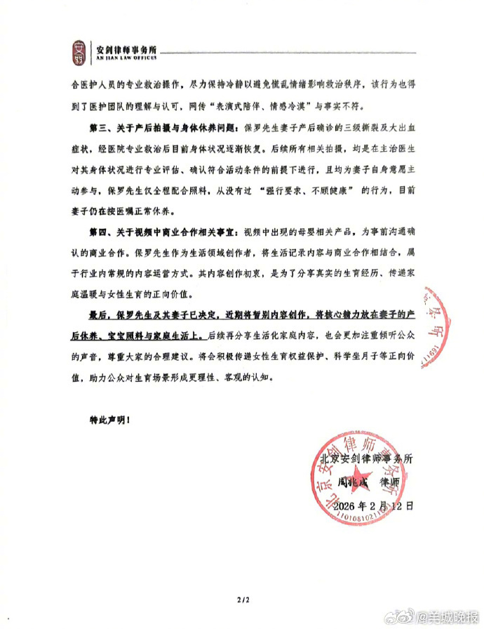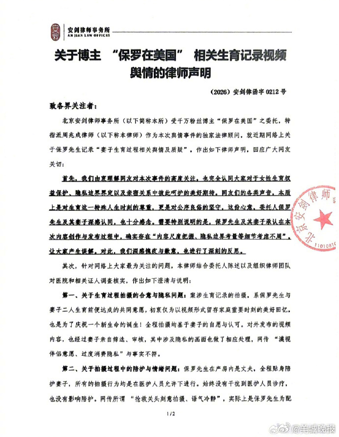 【#保罗夫妇决定暂别创作#】#博主保罗道歉#2月12日,发布【关于博主"保罗在美国"相关生育记录视频舆情的律师声明】。就生育记录视频舆情集中回应:承认内容尺度考虑不周并致歉;澄清拍摄系夫妻共同意愿、经妻子亲自审核,网传“漠视伴侣意愿”“表演式陪伴”不实;产后拍摄均在医生评估、妻子主动参与下进行。保罗夫妇决定暂别创作,专注妻子产后休养及宝宝照料。