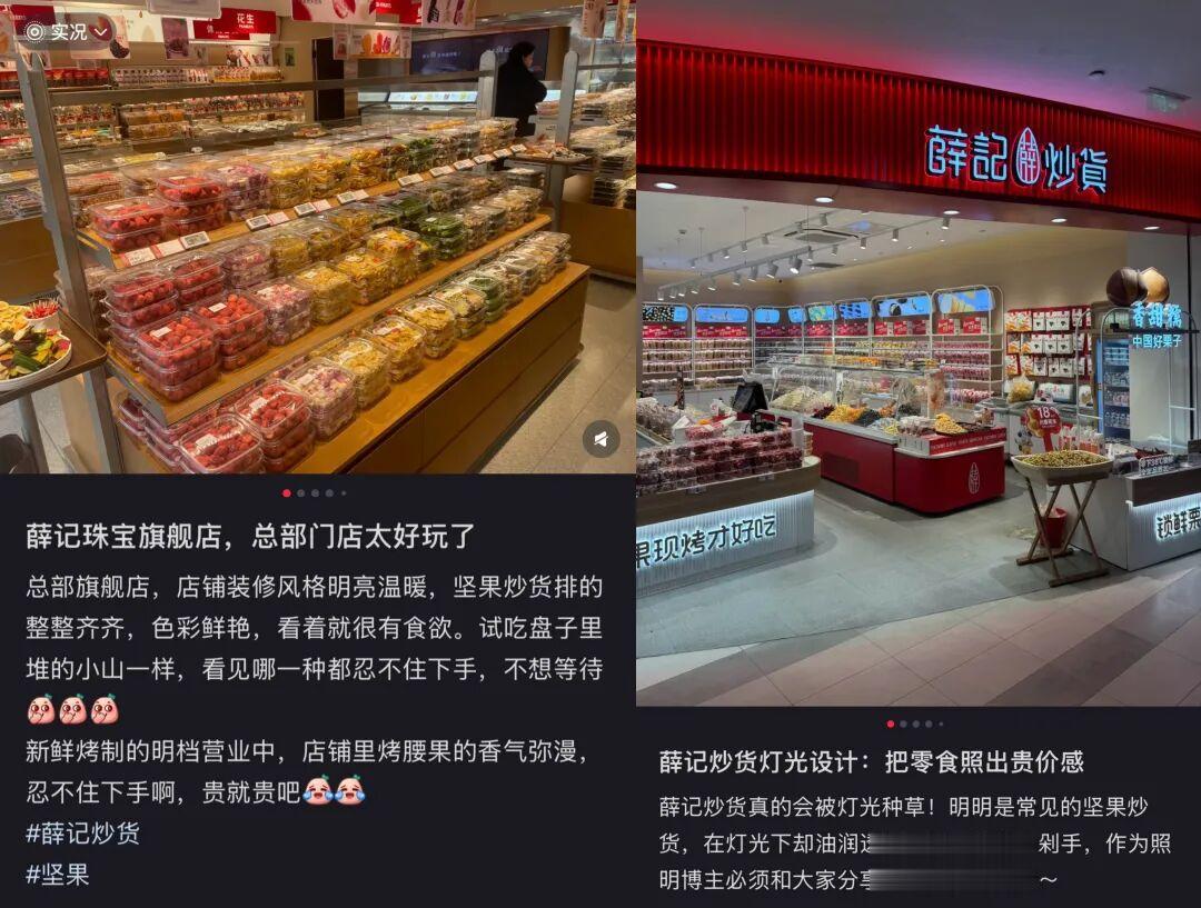 有人在小红书发帖分析“为什么薛记炒货店里的零食,看起来有一种贵价感”时,曾描述了一个场景:透明橱窗里的坚果摆得整整齐齐,果干颜色鲜亮。暖白光射灯打在蜜饯上,油润光泽拉满,尤其是现烤腰果那一片,暖光裹着焦香,看着就比街边的炒货有质感。