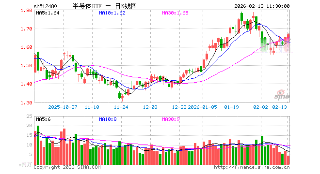2月13日,截止午间收盘,半导体ETF(512480)涨0.85%,报1.666元,成交额7.50亿元。半导体ETF(512480)重仓股方面,寒武纪截止午盘涨0.58%,中芯国际涨0.32%,海光信息跌0.89%,北方华创涨3.39%,兆易创新涨2.89%,澜起科技跌1.36%,中微公司涨0.77%,豪威集团跌0.30%,拓荆科技涨3.86%,紫光国微跌0.34%。