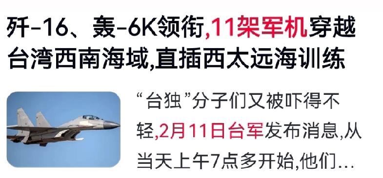 11架次解放军军机清晨出击,直扑西太平洋! 2月11日清晨7时44分起,台军方陆续侦获歼-16、轰-6K及运油-20等11架次解放军军机出海。机群进入台湾西南空域后,一路穿越巴士海峡,直奔西太平洋,展开远海长航与海空联合训练。 台军方称,这仅是早上出动的首批架次,后续或有更多军机升空,具体总数需待12日上午公布。 此次远海长航是多型军机组成大编队前出西太的实战化演练,核心课目是模拟“区域拒止”作战。运油-20首次在编队中承担为歼-16等战机空中加油的重任,大幅延伸打击半径。 巴士海峡是大陆前出台湾东部海域的关键通道,解放军舰机早已在此常态化巡航。频繁穿航不仅将其打造成“空中走廊”,运油-20更常驻此域演练加油。台军方此番特别提到“海空联合训练”,不禁让人联想:巴士海峡及台湾东部海域,究竟有多少解放军舰艇正在同步操演? 对此你怎么看?