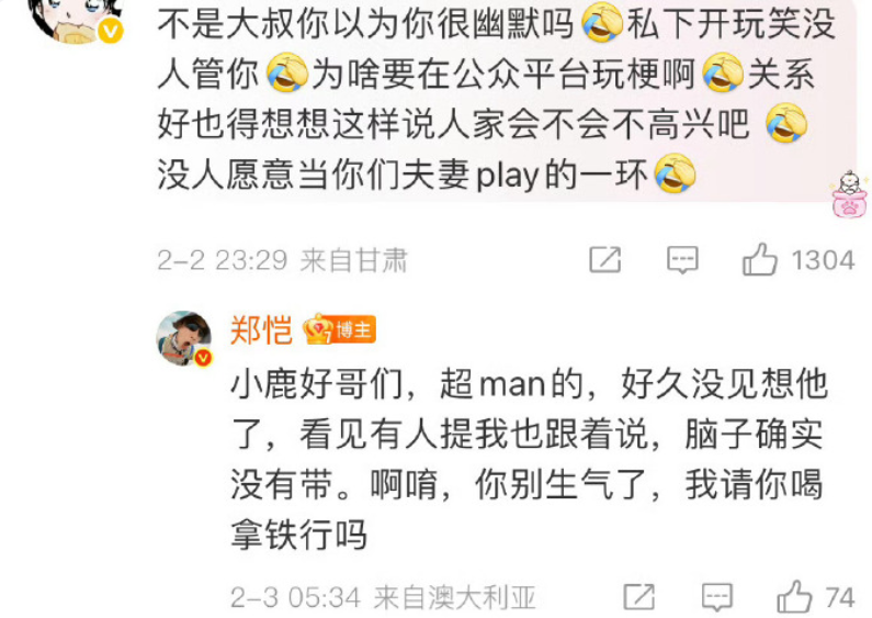 眼看评论区炸了锅,郑恺连夜出来“灭火”。这道歉吧,也是让人一言难尽。他说鹿晗是他好哥们,很man,自己就是太久没见想他了,脑子没带就跟着玩梗,最后还来了一句:“别生气了,请你喝拿铁行吗?”