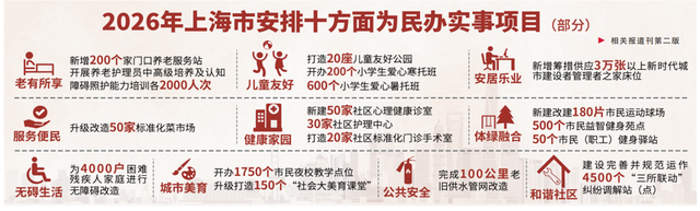 2026年上海市为民办实事项目发布,涵盖十方面32项38小项。其中新增项目包括:开展养老护理员能力培训、新建社区心理健康诊室、帮助长期失业人员再就业、新增家门口养老服务站、新建改建长者运动健康之家、筹措供应新时代城市建设者管理者之家床位等。