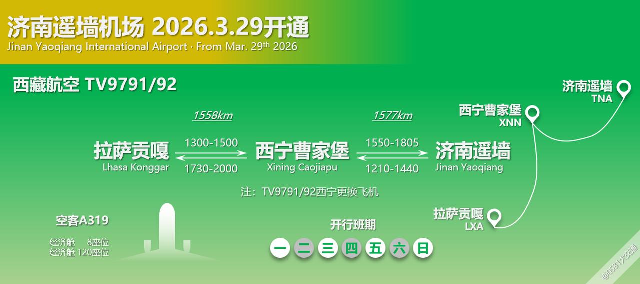 2026夏秋航季西藏航空将开通两条济南-拉萨航线,3月29日起开通TV9791/92拉萨贡嘎-西宁曹家堡-济南遥墙航线,每周一三五日开行[狗头][狗头];3月31日起开通TV9773/74拉萨贡嘎-西安咸阳-济南遥墙航线,每周二四六开行[黑线][黑线]。此两条航线济南-西宁/西安段的机型为空客A320,而西宁/西安-拉萨段的机型为空客A319,因此此条航线大概是要在西安/西宁更换飞机[无辜笑][无辜笑],从排班时刻上看,济南-西宁-拉萨方向和拉萨-西安-济南方向的航班在经停地经停的时间均达到了接近3个小时,也印证了上述航线需在经停地更换为飞机[震惊][震惊]。2019年时西藏航空曾开行济南-银川/西宁-拉萨航线,后边还开行过济南-西安-日喀则航线,但济南-西安-拉萨航线应该是首次开通[惊喜][惊喜]。由于新航季北部湾航空继续开行济南-南充-丽江航线,因此此前夏秋航季稳定开行的拉萨-南充-济南是很难开起来了,所以能开通经西宁/西安飞拉萨的伪直飞航线也算是不错的选择了[机智][机智]
