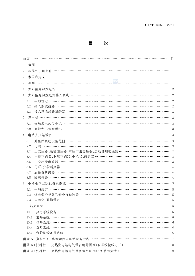 该标准共分为10部分(15页),本文件规定了太阳能光热发电站、太阳能光热发电站接入系统、发电机、电站升压站设备、电站电气二次设备及系统、热力系统等调度命名规则。