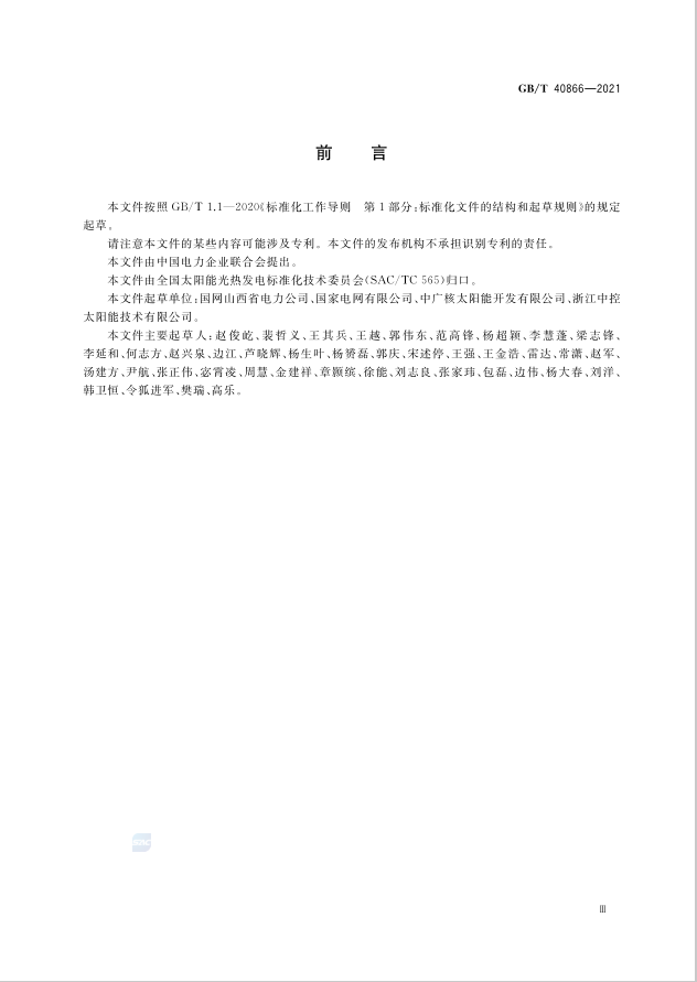 国家标准《太阳能光热发电站调度命名规则》,标准号:GB/T40866-2021,归口单位:中国电力企业联合会,自2022年5月1日起实施。