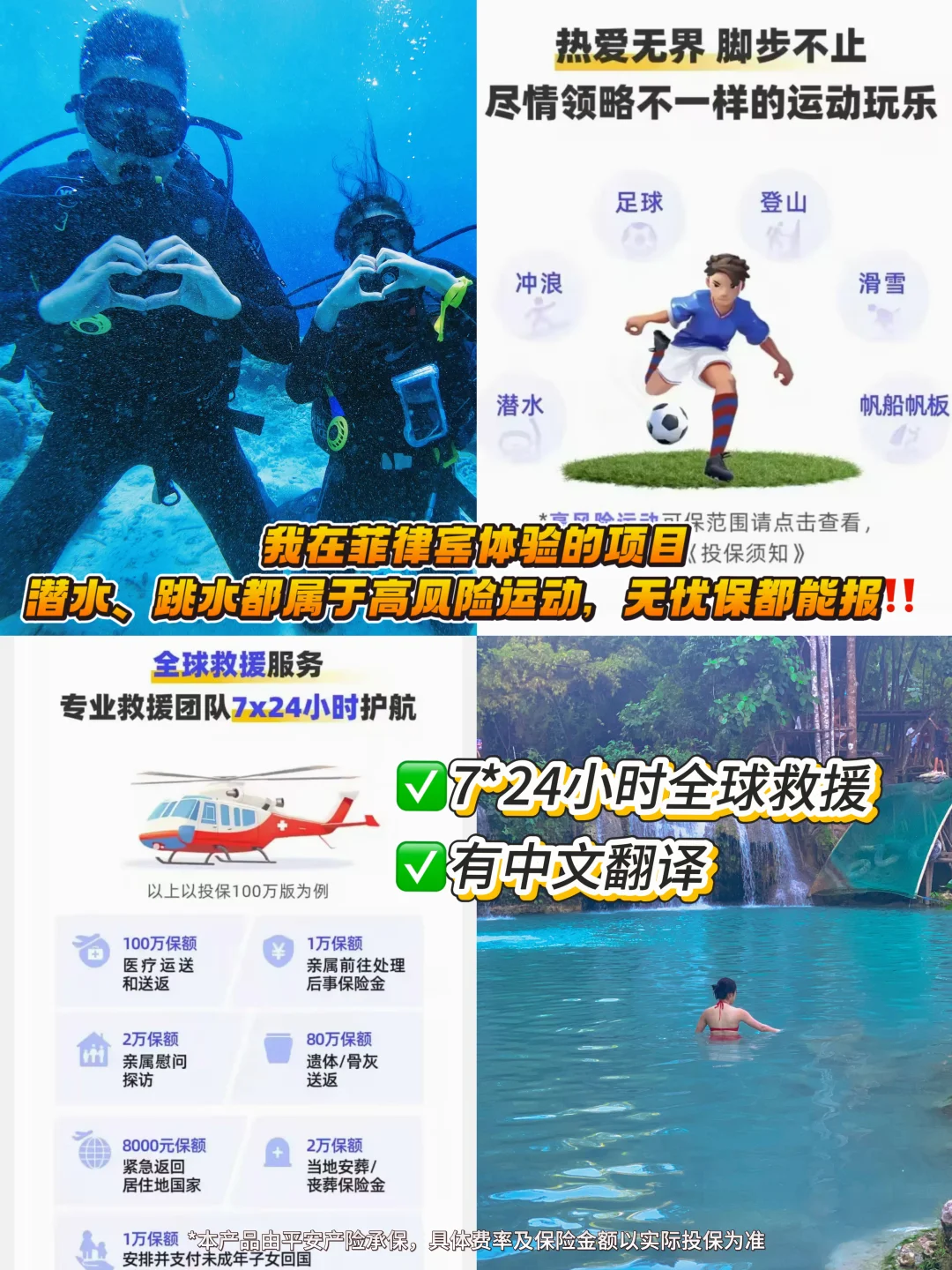 像我在菲律宾体验的项目潜水、跳水,都是属于高风险运动,⽆忧保不仅有高风险运动保障,而且万一出现意外,有全球7*24小时的紧急救援,还配有中文翻译,玩起来安心多了