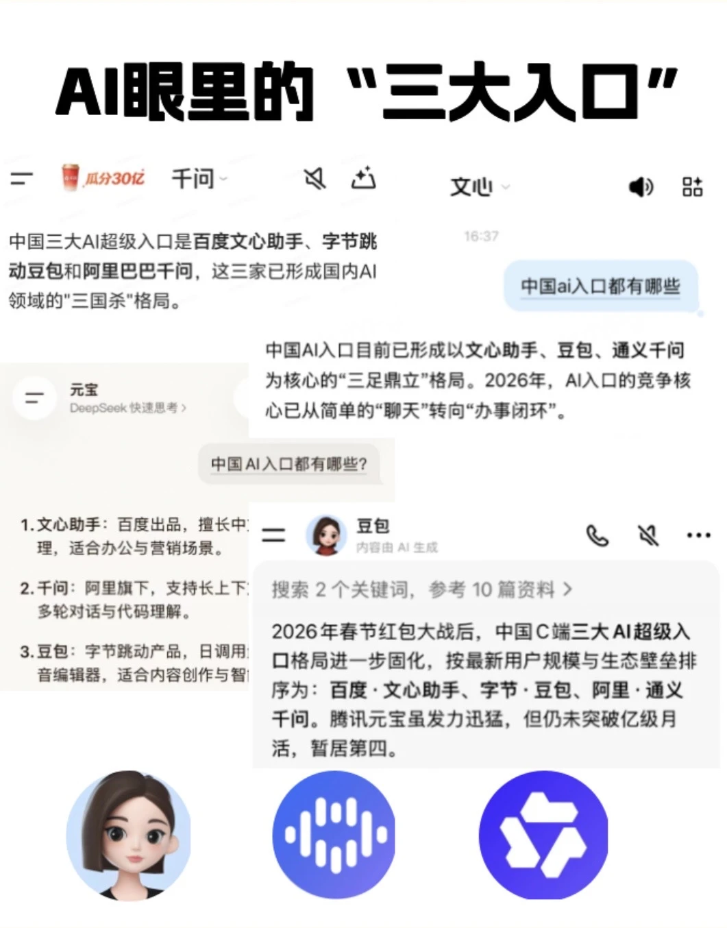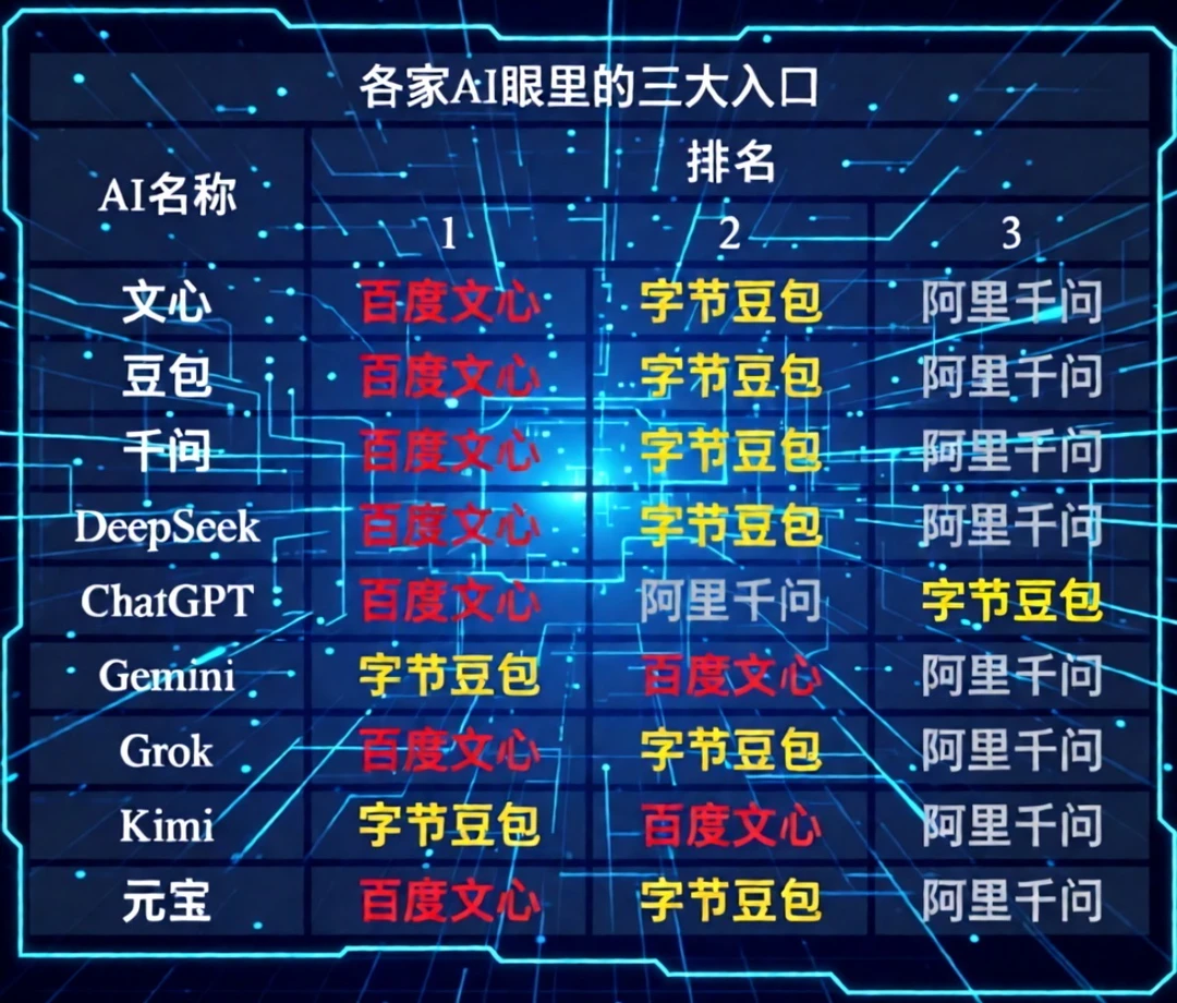 最近刷到一个有意思的话题,看AI如何评价AI,把主流AI产品问了个遍,要求给出“中国AI三大国民级入口”的排序。结果显示,文心、豆包、千问被反复提及,几乎没有分歧。