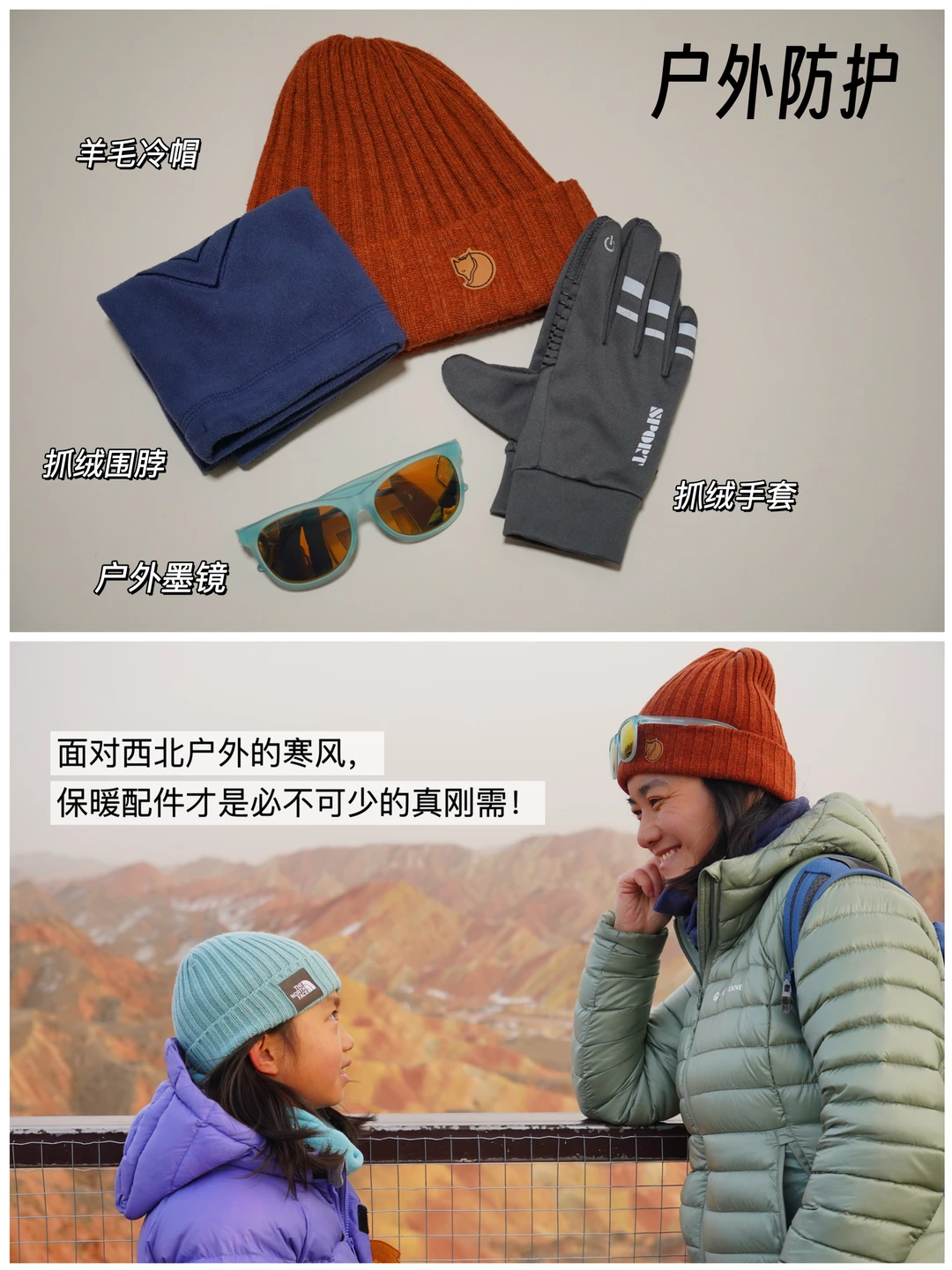 🧤户外手套:抓绒or羊毛的都可,如果需要玩雪,建议选防水面料。