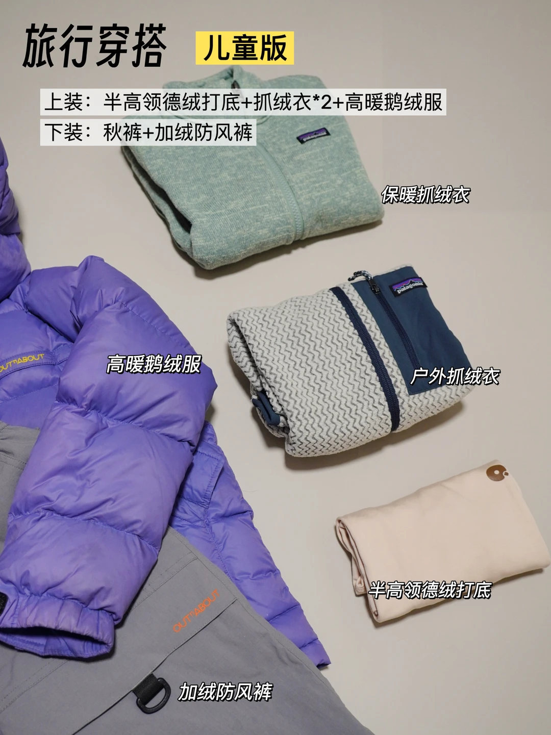 上装:半高领德绒打底+抓绒衣*2+高暖鹅绒服