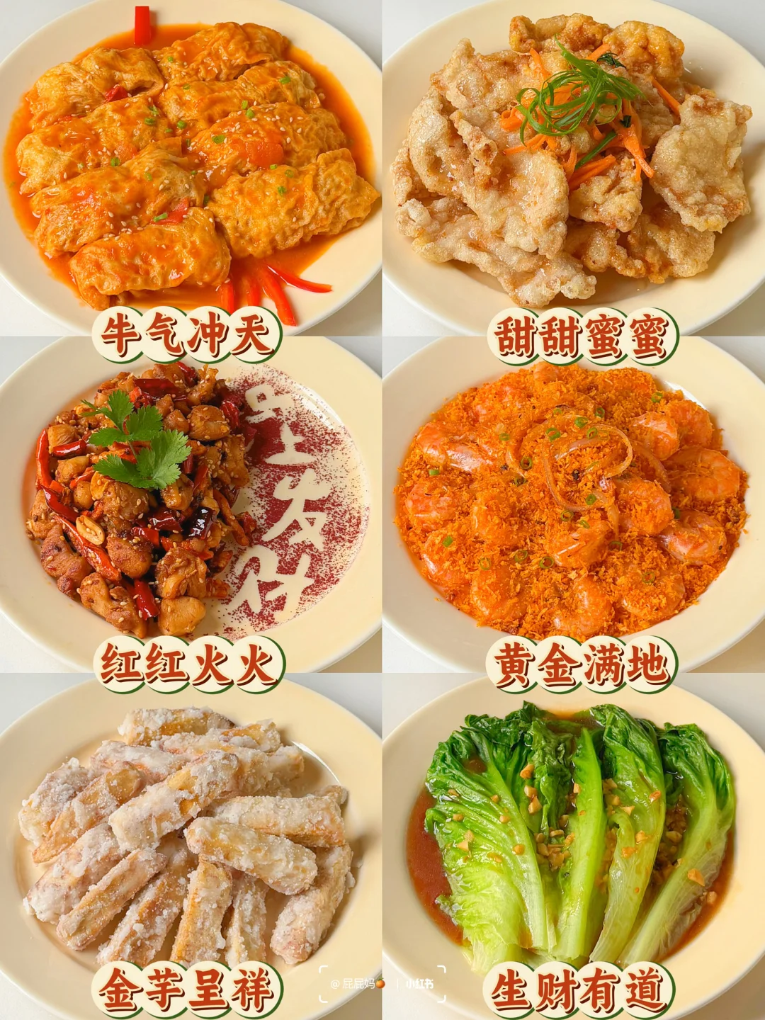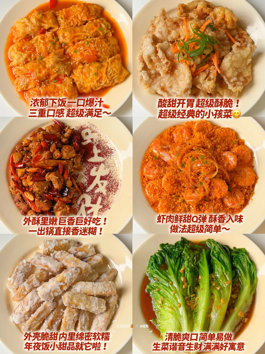 马上就到除夕啦🧨年味也越来越浓~ 今天分享6款年夜饭菜谱,做法嘎嘎简单,厨房小白也能轻松露一手✌🏻鲜香甜辣都有,😋色香味俱全,安排起来吧👏🏻 - 🧧牛气冲天(番茄肥牛响铃卷) 🧧红红火火(辣子鸡丁) 🧧生财有道(蚝油生菜) 🧧黄金满地(避风塘炒虾) 🧧甜甜蜜蜜(锅包肉) 🧧金芋呈祥(反沙芋头) - 🔍具体做法看图哦 - 解锁了超多新口味菜谱~ 🎉给年夜饭加点滋味,轻松复刻餐厅的味道