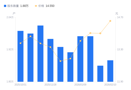 日期A股户数(户)流通A股户均持股数(股)户均持股市值(万元)2026-02-10188007645.8211.122026-01-30186007728.0310.832026-01-20197007296.5210.232026-01-09197007296.529.982025-12-19191007525.739.722025-12-10193007447.749.532025-11-28196007333.759.832025-11-20201007151.329.702025-11-10198007259.6710.082025-10-31199007223.199.81