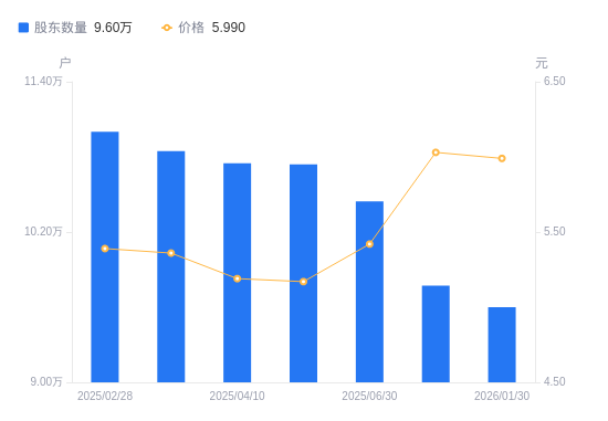日期A股户数(户)流通A股户均持股数(股)户均持股市值(万元)2026-01-309600013868.608.312025-09-309773113622.968.212025-06-3010443812748.106.912025-04-1810740012396.526.412025-04-1010750012384.986.432025-03-3110846312275.026.582025-02-2811000012103.516.522025-01-2711000012103.516.612025-01-2011000012103.516.632024-12-3111127311965.046.71