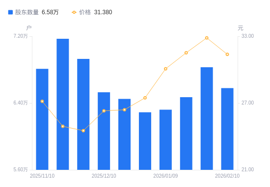 日期A股户数(户)流通A股户均持股数(股)户均持股市值(万元)2026-02-106580034156.69107.182026-01-316830032906.45108.132026-01-206470034737.41109.492026-01-096320035561.87106.972025-12-316290035731.4898.152025-12-206450034845.1291.992025-12-106530034418.2390.522025-11-306930032431.6179.522025-11-207170031346.0378.082025-11-106810033003.0989.64