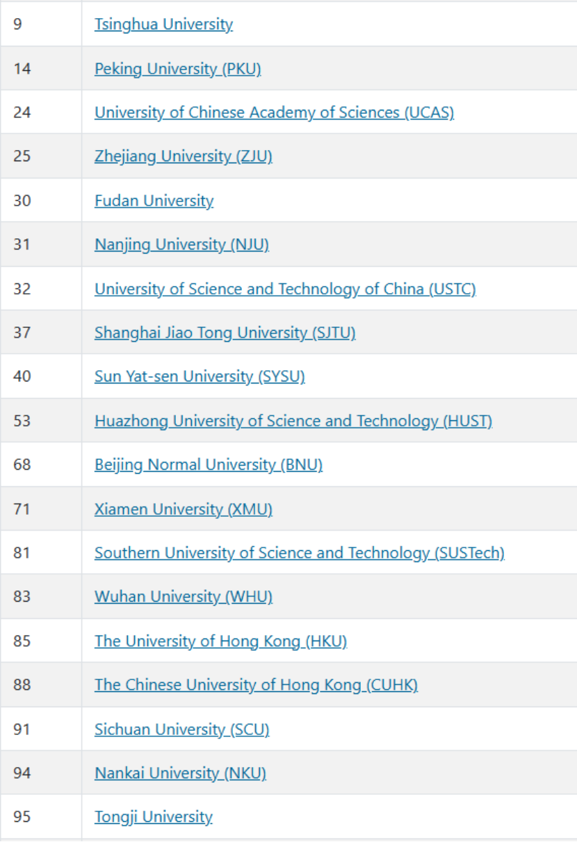 清华大学(第9位)、北京大学(第14位)、中国科学院大学(第24位)、浙江大学(第25位)、复旦大学(第30位)、南京大学(第31位)、中国科学技术大学(第32位)、上海交通大学(第37位)、中山大学(第40位)、华中科技大学(第53位)、北京师范大学(第68位)、厦门大学(第71位)、南方科技大学(第81位)、武汉大学(第83位)、香港大学(第85位)、香港中文大学(第88位)、四川大学(第91位)、南开大学(第94位)、同济大学(第95位)。