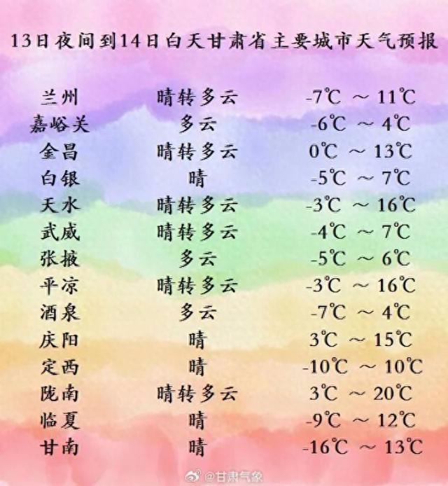 2月14日夜间到15日白天,酒泉、嘉峪关、甘南、临夏、定西、陇南、天水、平凉等市州多云转阴,局部地方有小雪(雨)或雨夹雪;省内其余地方晴或多云。酒泉市有4至5级偏东风,局部地方有沙尘。