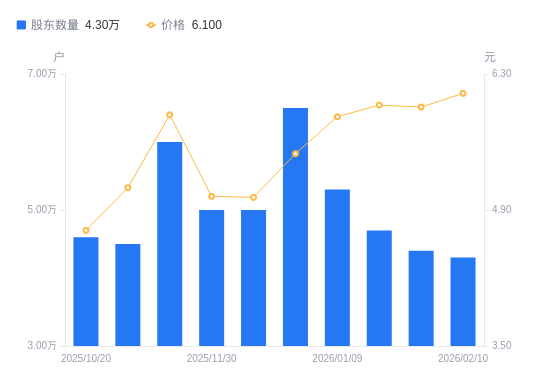 日期A股户数(户)流通A股户均持股数(股)户均持股市值(万元)2026-02-104300021046.9712.842026-01-304400020568.6312.262026-01-204700019255.7411.512026-01-095300017075.8510.012025-12-196500013923.387.632025-12-105000018100.409.102025-11-305000018100.409.122025-11-106000015083.668.872025-10-314500020111.5510.322025-10-204600019674.359.23