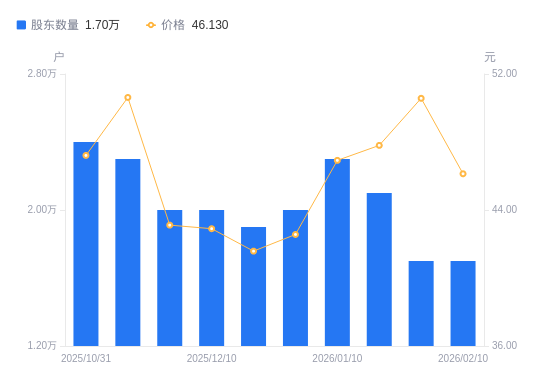 日期A股户数(户)流通A股户均持股数(股)户均持股市值(万元)2026-02-10170005281.2024.362026-01-31170005281.2026.712026-01-20210004275.2620.442026-01-10230003903.4918.322025-12-31200004489.0219.112025-12-20190004725.2819.652025-12-10200004489.0219.262025-11-30200004489.0219.352025-11-10230003903.4919.762025-10-31240003740.8517.66