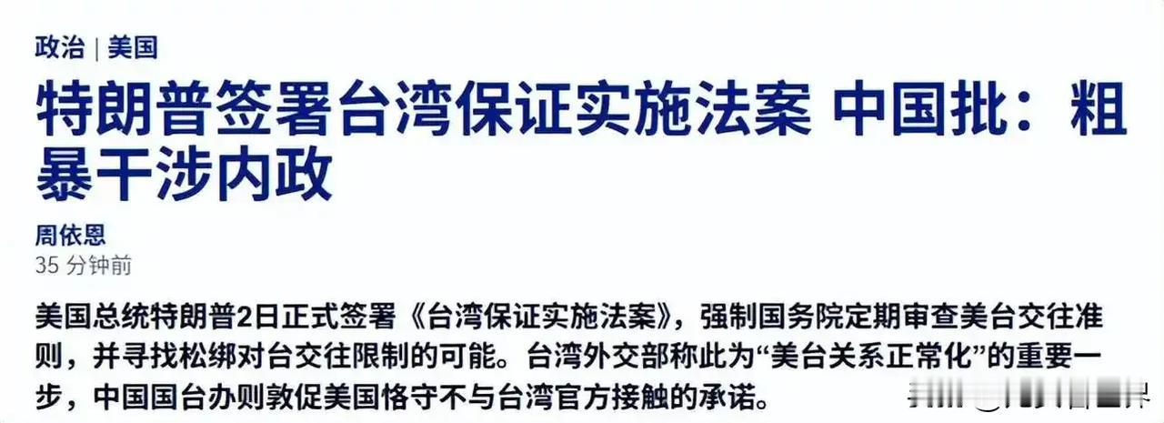 美国出台“台湾保护法案”,那意图可太明显了,就是想搅乱台海局势,从中渔利。表面上说是“保护台湾”,搞什么金融制裁和国际孤立那一套,可实际上连美军出兵介入台海冲突的承诺都没有,关键时刻总统一句话就能让法案暂停,这就是在给自己找撤退借口,妥妥的战略退缩。 美国众议院以395票赞成通过涉台法案,还妄图把中国踢出国际金融体系,和日本一唱一和。但中国也不含糊,直接打明牌,连对台军的称呼都改了。岛内也有不少人看清了美国的真面目,不再盲目信任美方承诺。台海走势终究掌握在两岸中国人手里,美国这算盘注定打不响。