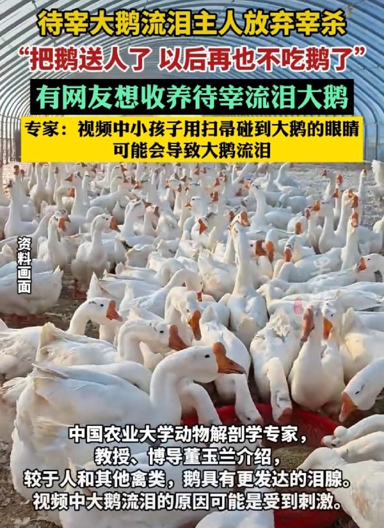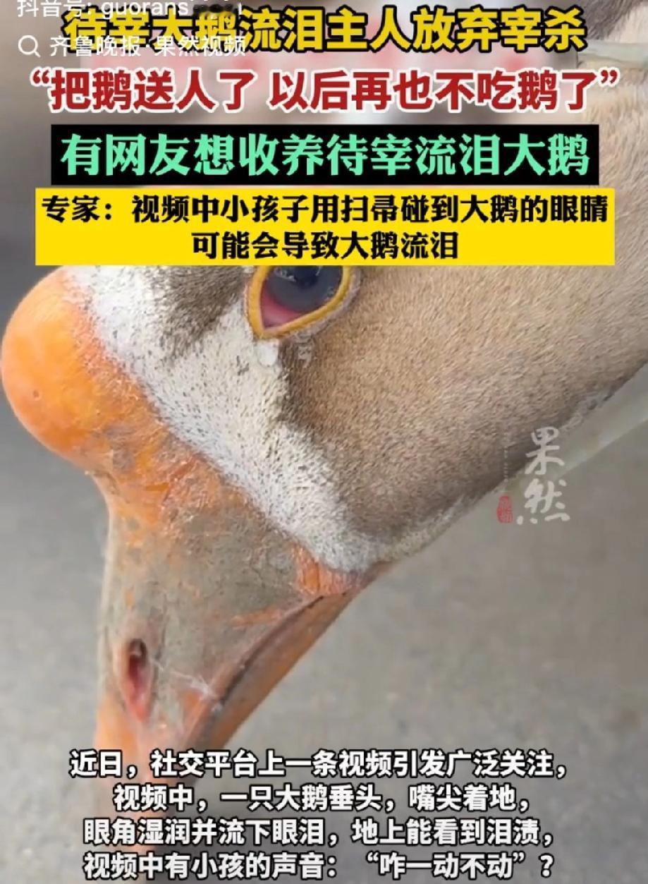 解释不清了!烧水待宰,大鹅却流下“两行清泪”视频拍摄者配文:“才开始烧热水,它就掉眼泪了,到底杀还是不杀,吃还是不吃?” 这视频一传上网,评论区纷纷喊话求放过。 原来,这只大鹅是他最近特意买回来的,原本计划在2月12日这天,在安徽老家把它宰了改善伙食。谁承想,刚把水烧热,还没动刀子,大鹅就垂头,嘴尖着地,并流下眼泪,地上能看到泪渍,于是就记录了下来发到网上。 随后有网友留言:“少吃这口肉也可以,有灵性的动物就别杀了。” 还有网友留言:“我亲眼看到过大鹅流泪,从那时我忽然明白,世间万物不比人类低级到哪里,人类也不比世间万物高级到哪里,它们只是投错了胎体,众生本该平等。” 对于“流泪”这个玄乎的现象,博主也给出了自己的解释:“可能是小孩玩扫帚时碰到了大鹅的眼睛,导致它流泪。” 但面对网友的评论和那只“流泪”的大鹅,博主的心态彻底崩了。 他坦言:“这只鹅我不敢吃了,我以后再也不吃鹅。” 这只因为几滴眼泪而“保住性命”的大鹅已经被送人了,至于它现在是在别人家下蛋,还是依旧难逃宿命,博主表示自己也不是很清楚,也不敢多问,总之是从自家案板上撤下来了。 而动物专家称,鹅的泪腺发达,流泪可能是受到外界刺激。 不过无论大鹅流泪是因为被扫帚碰到了眼睛,还是真的预感到了生死,它触发的情感是真实的。 我们常说“君子远庖厨”,不是说不吃肉,而是那份对于生命流逝的恻隐之心不该被磨灭。 或许这只大鹅流泪只是正常现象,但我们心底那份人性的善念依旧在。 万物有灵,无论是巧合还是真情,保持一份敬畏,总归是没错的。