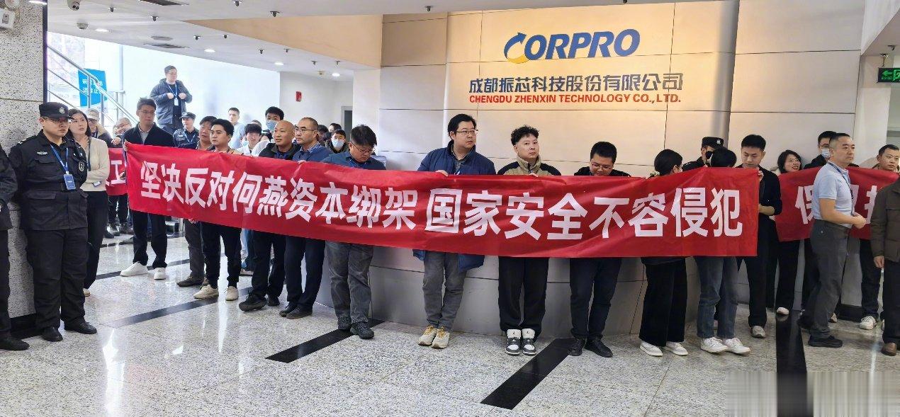 张晓晖/摄2月12日下午,振芯科技的员工在公司大楼抗议实际控制人何燕“资本绑架”