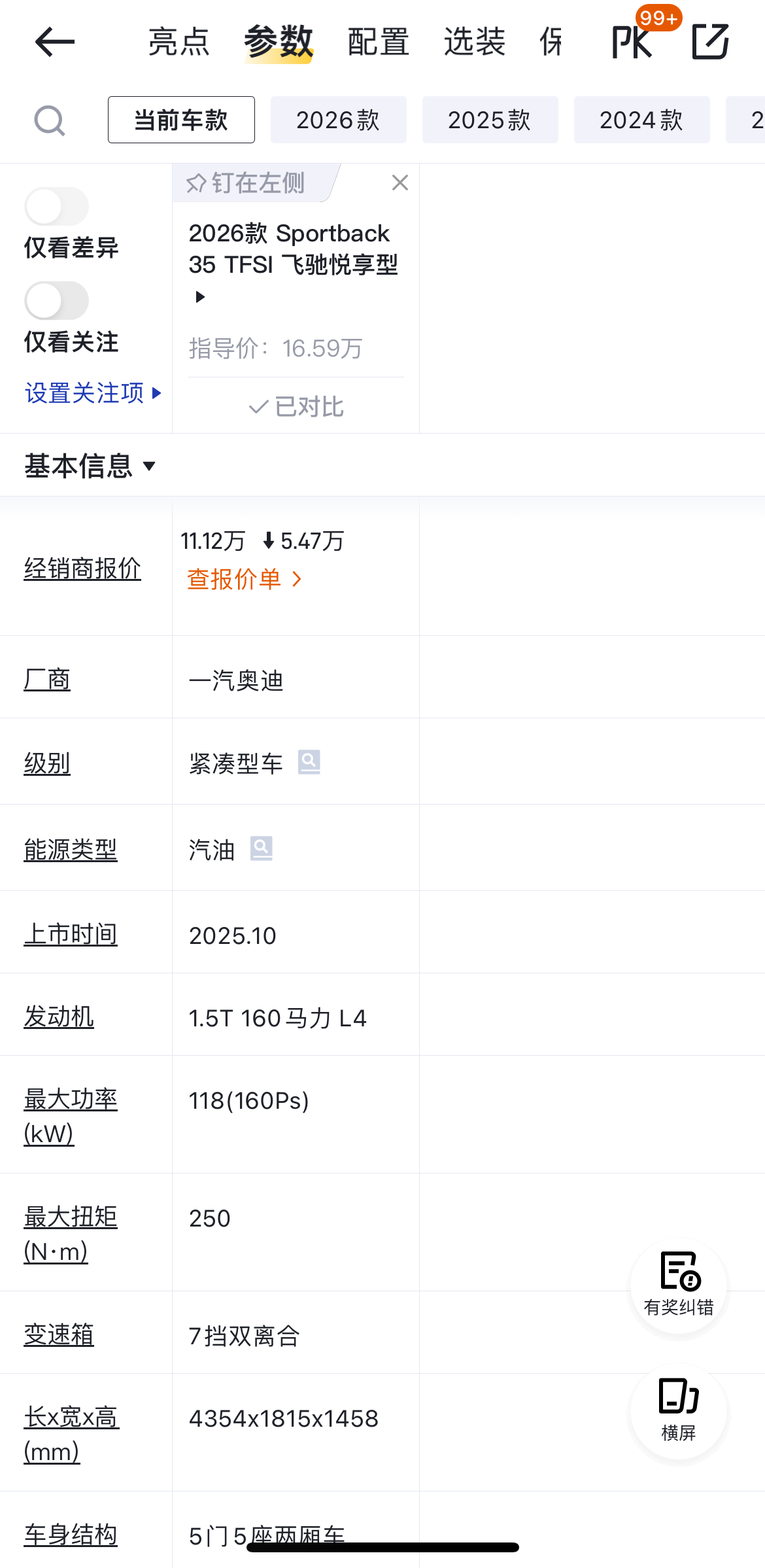 大家好,我是开了十来年车的老司机。最近听说奥迪A3降价挺猛,特别是入门版车型2026款A3 Sportback 35TFSI飞驰悦享型,指导价16.59万,现在优惠补贴完裸车价11.12万,好多朋友都在问我值不值,今天我就跟大家聊聊这款车,看看咋样,不吹不黑,给想买这车的朋友提供一些参考。 1.动力够用,但不猛 这车用的是1.5T发动机匹配7挡双离合变速箱,发动机最大功率118KW,百公里加速8.6秒。说实话这数据不算快,比起一些同价位的国产车可能还弱一些。但日常开绝对够用了,城市里超车、高速巡航都没问题,不会拖后腿。 底盘悬挂是前麦弗逊后多连杆,过减速带应该不怎么颠簸,属于这个价位的主流水平,中规中矩,没啥惊喜也没啥大毛病。如果你是追求激情驾驶的,可能有点平淡;但要是就图个代步,那它完全能应付。 2.空间日常够用,但也别指望多宽敞 车长4米35,轴距2米63,是标准的5座两厢车。后排坐三个成年人不会太挤,短途出行没问题,后备箱也能塞下几个行李箱或婴儿车。 但实话实说,空间不算大,尤其后排中间位置,长途坐久了可能不舒服。后备箱空间够日常买菜、接送娃,如果经常拉大件行李,就得掂量一下了。整体来说,适合小家庭或单身族,多人长途旅行就别强求啦。 3.安全配置有基础,但得加钱 这车标配了前方碰撞预警、DOW开门预警、主动刹车和疲劳驾驶提示,遇到紧急情况能帮一把。不过倒车车侧预警、并线辅助这些得额外选装,车道保持和车道居中更是没有。前排膝部气囊也缺席了,这点得注意。 倒车只有一个后雷达和基础影像,前雷达和360全景都得花钱加装。L2级辅助驾驶更是想都别想,这车就给你个简单的定速巡航凑合用。个人觉得标配的安全功能够应付日常,但如果你经常跑高速或停车环境复杂,选装项可能得多考虑。 4.便利功能省心少,选装费劲 这车标配了普通遥控钥匙和支持无钥匙启动,但无钥匙进入、遥控挪车、HUD抬头显示和原厂ETC都得加钱选装。语音系统能唤醒主副驾驶座,但不能连续说话,识别指令有点笨。 另外后视镜的电动折叠、锁车自动折叠、倒车自动下翻这些实用功能,也全要额外掏钱。好在自动雨刷是标配,雨天开车省点心。总之,基础功能够用,但想更舒坦得花钱,预算紧的话得考虑哪些选装真必要。 5.降价后值不值,看你需求 如果你是图奥迪品牌、日常代步够用,动力空间安全都满足基本需求,那这价绝对值,合资车这档次,以前想都别想。但缺点也不少:选装项多,科技配置一般,智能语音控制系统也弱。要是你追求智能驾驶或豪华体验,加钱后可能不如看看同价位其他车型。 总之,降价让它性价比上来了,适合预算有限、看重品牌和实用性的朋友。建议有机会亲自去试驾一圈,重点体验空间和选装项,别光看价格冲动下单。希望我的分享能帮到大家。