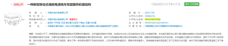 近日,在国家知识产权局上公布了一项公开号为CN121507212A的名为“一种新型移动式储能电源拖车双层散热机箱结构”的专利,公开信息显示,该专利申请日期为2025年11月,专利申请机构为河南许继仪表有限公司,发明人为“赵泽中卢利军王浩程文璐孙应军卢晓光石磊刘文强”,地址为河南省许昌市城乡一体化示范区魏武大道以东尚集街以南许继智能电网产业园内。