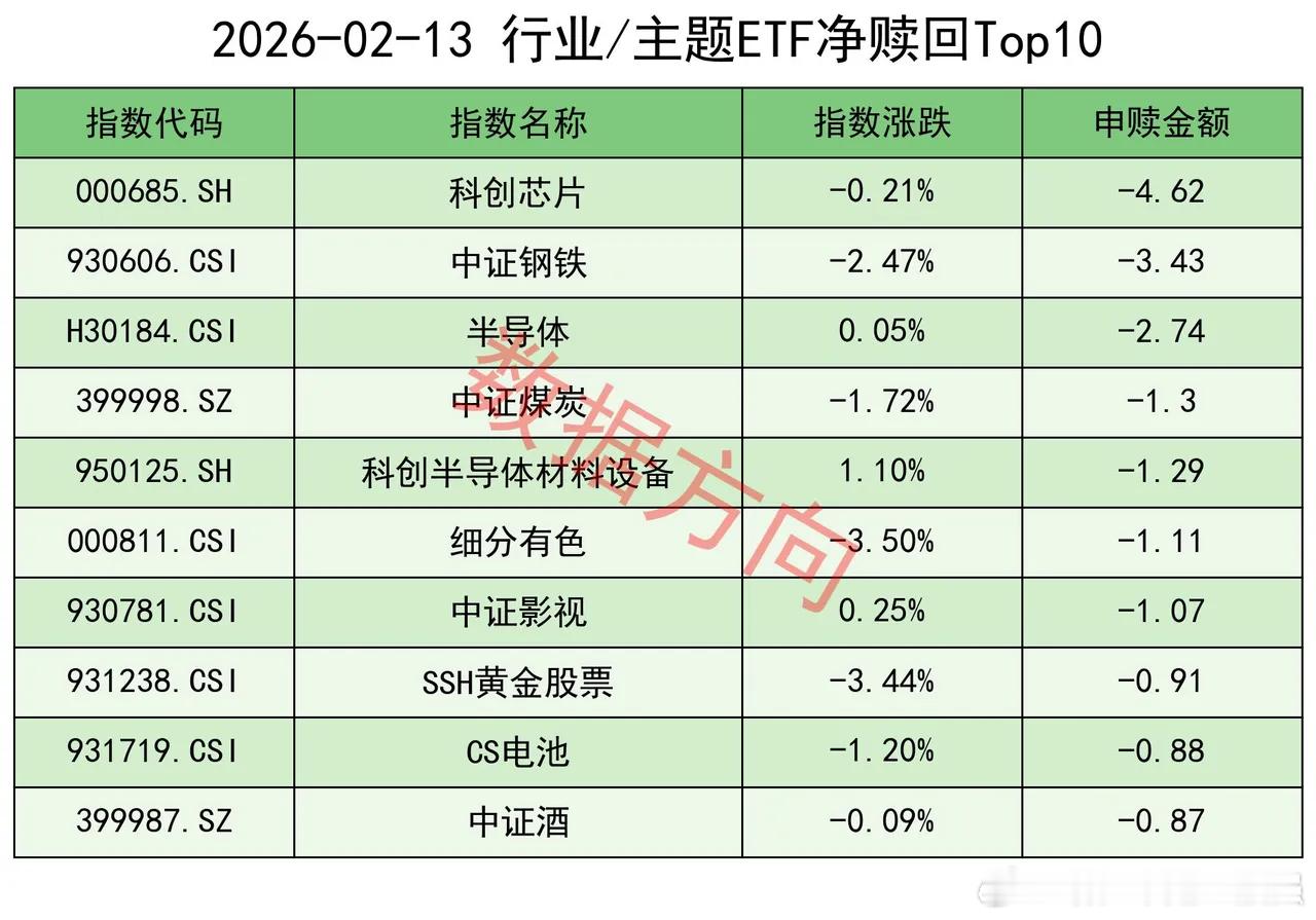 有色金属指数(3.78亿)、工业有色指数(1.97亿),一起进入申购icon榜;中证钢铁指数(-3.43亿)、细分有色指数(-1.11亿)、SSH黄金股票指数(-0.91亿),一起进入赎回榜。