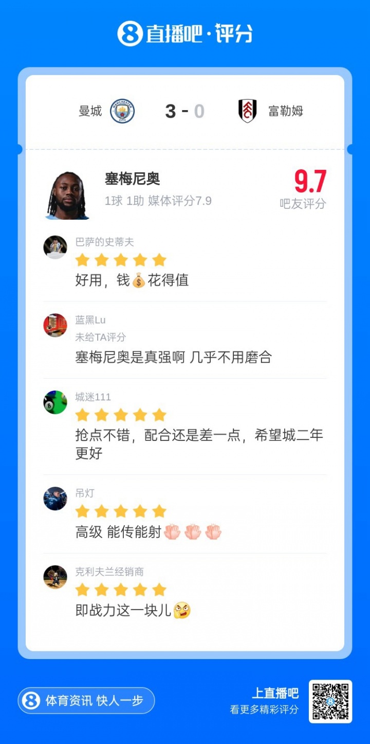 在曼城3-0富勒姆的比赛中,塞梅尼奥传射建功帮助球队全取3分,当选[直播吧X咪咕体育英超第26轮最佳球员]。加盟曼城1个月时间,26岁的塞梅尼奥无缝衔接,为曼城出战8场比赛,全部首发稳坐主力,收获5球2助状态非常出色。