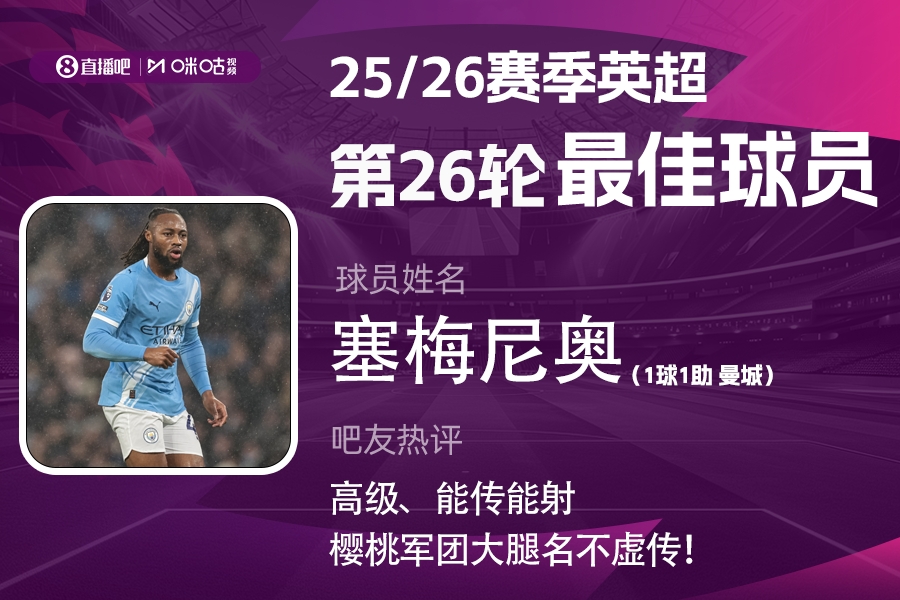 2025-2026赛季英超火热进行中,直播吧和咪咕体育联合发起每轮英超最佳球员评选活动!第26轮评选结果已经出炉,曼城前锋塞梅尼奥当选!