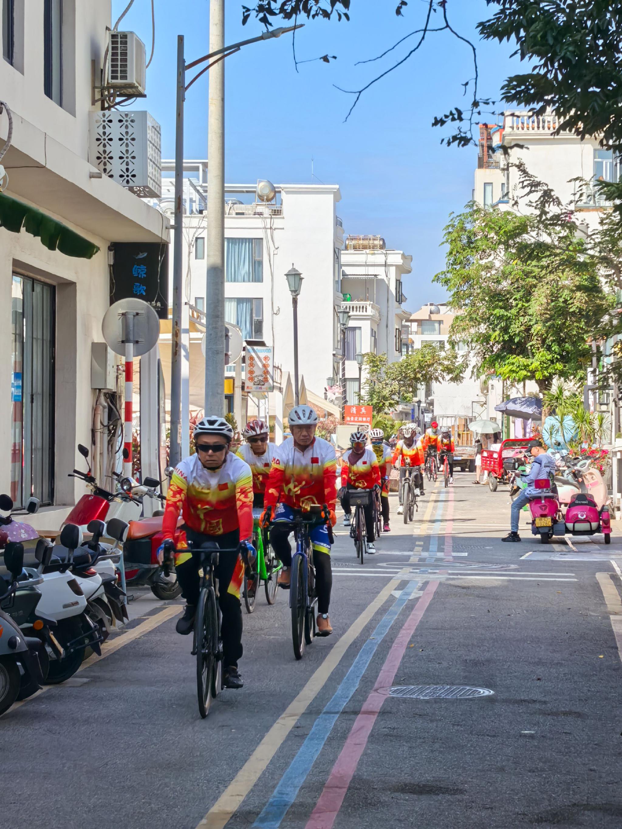 图为游客骑行赏景,途经天涯小镇。杨松摄