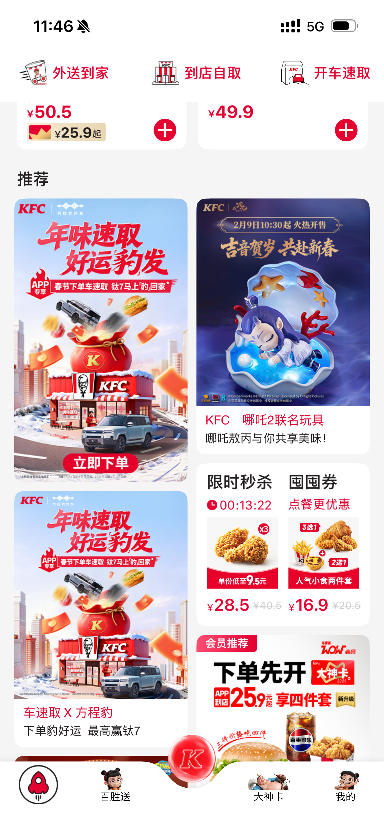 有点意思是马年新春,方程豹和肯德基一起送福利啦!2月10日到23日,上肯德基APP用车速取下单,就能免费抽奖!