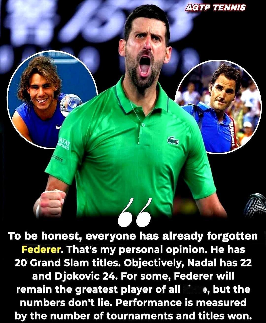 别再吹费德勒是“史上最佳”了,数据不会说谎,我们可能都欠德约科维奇一个道歉。 翻开记录册,冰冷的数字砸在脸上:德约24座大满贯,纳达尔22座,费德勒的20座,已经被硬生生挤到第三。 你再看世界第一的周数,德约科维奇428周,几乎是整整8年,把费德勒的310周远远甩在身后。 就连“王中王”年终总决赛,也是德约7-6领先。 我知道你会说,费德勒打球是艺术,是芭蕾。 但竞技体育的铁律是什么? 是胜利。 是奖杯压弯了荣誉室的隔板,而不是优雅的姿态。 我们迷恋的,是记忆中美化的优雅;而我们必须尊重的,是现实中碾压一切的强大。