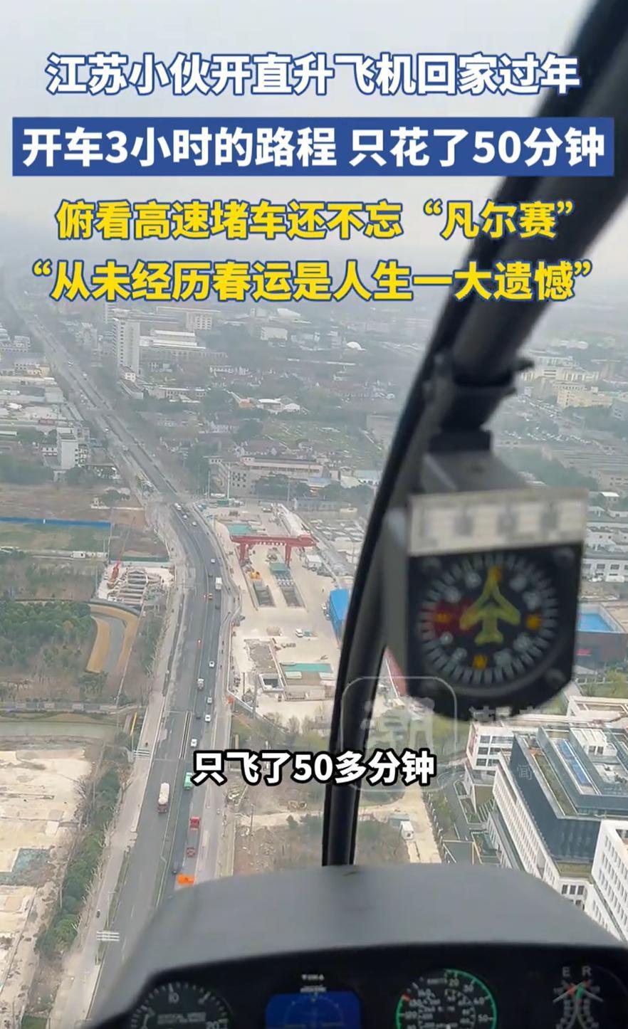 有钱任性!江苏,一男子从南京回淮安过年,可别人都是开车堵在路上,他却直接开直升飞机,只花50分钟就到家吃饭,而男子的发言也是相当凡尔赛:人生最大遗憾就是没经历过春运堵车 江先生介绍,自己平时在南京做生意,逢年过节都会回淮安老家跟家人团聚。从南京到淮安,直线距离206公里,开车正常情况要三小时,赶上春运堵车,五六个小时也是常事 而他呢,全程飞了不到一小时,不仅避开了所有拥堵,还顺手拍了一段视频:镜头从驾驶舱往外扫,下面是密密麻麻、一动不动的车流,上面是晴空万里、畅通无阻 他调侃自己没经历过春运堵车,这话听着凡尔赛,其实也挺真实,毕竟,堵车这种事,确实是普通人春运的标配,而他的标配,是直升机 当然,这事儿也引发了不少人的好奇:直升机随便飞?航线想申请就申请? 其实没那么简单。根据相关规定,私人飞行器起飞前必须向空管部门申请航线,获批后才能执行飞行任务,尤其是跨市飞行,涉及的空域更复杂,审批也更严格。这位大哥能顺利飞回家,说明他是合法合规操作的,该走的程序都走了,不是想飞就飞的任性 能拥有私人直升机、能搞定航线审批、还能熟练驾驶飞行的人,确实不是普通老百姓的日常。他的凡尔赛,是有底气的 但话说回来,能在天上俯瞰堵车的人毕竟是少数,更多的人还是要在地面上、在车流里、在漫长的等待中,一点点挪回家。这才是春运最真实的底色