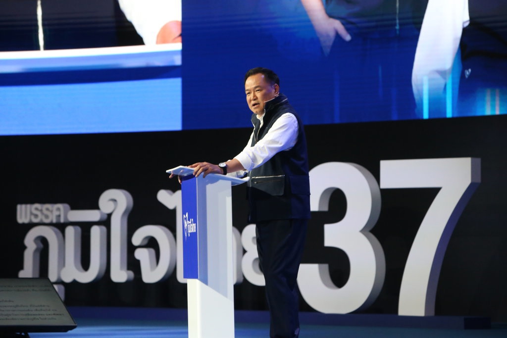 2月6日,泰国看守总理、自豪泰党总理候选人阿努廷在曼谷诗丽吉王后国家会议中心发表竞选演讲。图据新华社